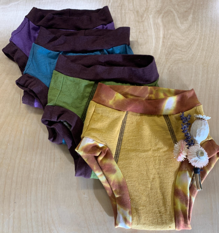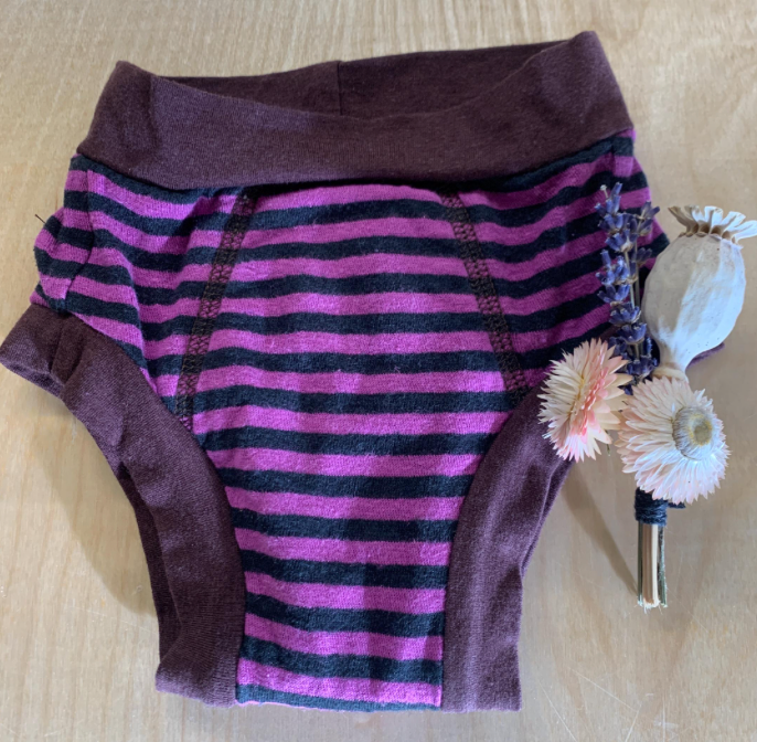 Our Sweet Pea Training Pants are designed to help your baby or toddler adjust to the feeling of wearing underwear without creating a puddle whenever they have an accident. They will feel wet when they do pee, which will be helpful in their potty training experience. They have an extra absorptive organic cotton waffle cloth layer built in as well as a waterproof layer to help hold in any accidents that may occur. Works great for elimination communication and diaper free practices. We do not recommend these for night time or nap time training, unless you are feeling confident.