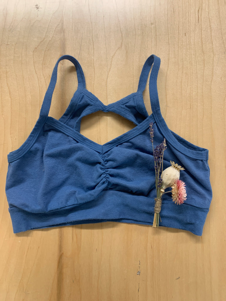 The cami bra has a slight racer back, and styled with a circle opening in the back for style or just breathability. Preshrunk.